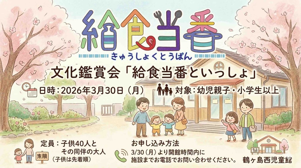 鶴ヶ島西児童館「文化鑑賞会」 SCHEDULE 2026/03/11(水) 10:00 - 2026年3月30日開催。 ※入場はお子様をお連れの大人の方に限ります。 詳細は施設に直接お問い合わせ願います。 URLをコピーする 報告する