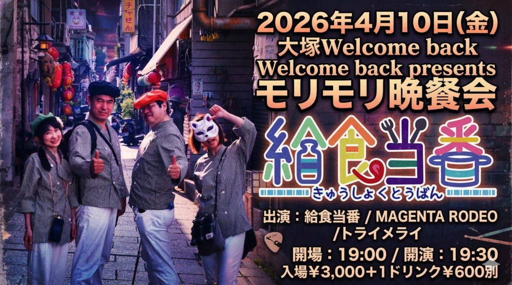 【ライブ情報】2026年4月10日(金) Welcome back presents モリモリ晩餐会 開場:19:00 開演:19:30 入場¥3,000+1ドリンク¥600別 出演:給食当番 / MAGENTA RODEO / トライメライ 会場:大塚Welcome back 今回の給食当番、写真の4人編成での出演です。 ご予約はDMまで!!